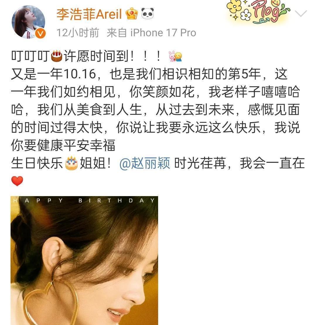 李浩菲发文祝福:“叮叮叮! 许愿时间到! 又是一年10.16,也是我们相识相知的第5年”。她亲切称呼赵丽颖为“姐姐”,感慨见面时间总是过得太快。